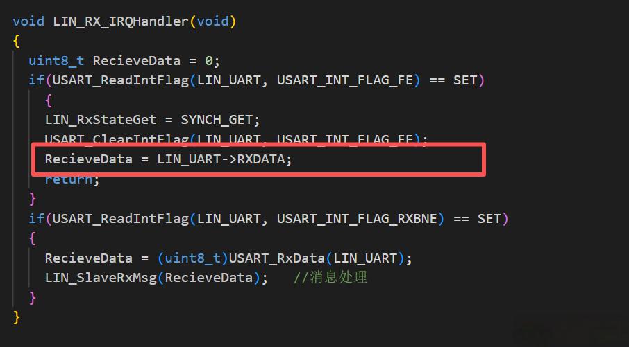 随后,调用LIN_SlaveRxMsg()函数,内部实现LIN接收状态机切换与报文解析逻辑。
