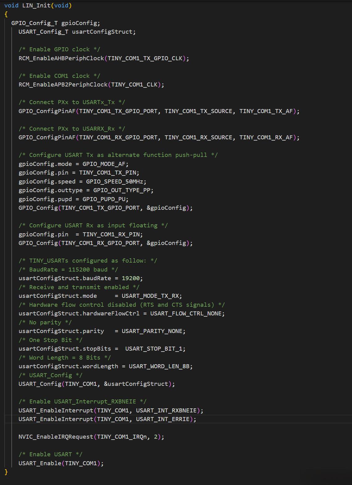 APM32E030的LIN物理层基于UART实现,其初始化流程与普通串口初始化基本一致,但需特别注意使能ERRIE(帧错误中断),用于在接收过程中检测同步间隔段(Break Field)。