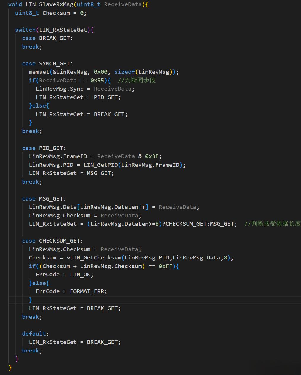 随后,调用LIN_SlaveRxMsg()函数,内部实现LIN接收状态机切换与报文解析逻辑。