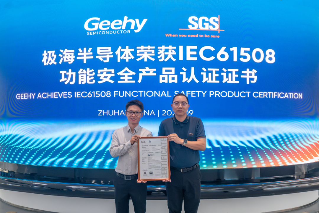 2025年9月15日,珠海——在SGS珠海分公司会议厅,一场简洁而隆重的授证仪式把“国产MCU安全里程碑”写进日历。国际第三方检测认证机构SGS向珠海极海半导体有限公司(简称“极海”)郑重递交IEC 61508 SIL 2 SC3功能安全证书,标志着极海G32R501D系列实时控制MCU正式通过全球功能安全“黄金标准”审核,成为首款同时拿下该等级与AEC-Q100 Grade 1车规可靠性的国产实时控制MCU。SGS中国区功能安全总监郑峥、商用产品南区经理姚朗贤、技术经理李昌取、BD经理李亚锦,与极海副总经理曾豪、MCU产品线总经理卢鹏升、市场负责人张瀚月、质量与认证负责人赵丰等双方核心团队共同见证了这一时刻。