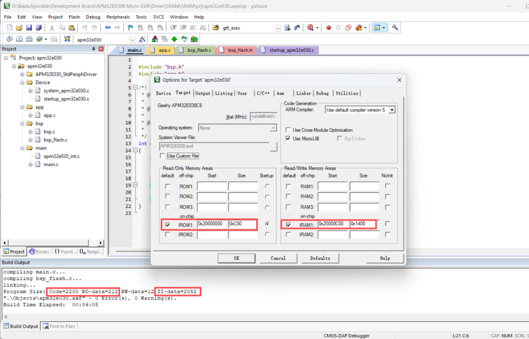 极海APM32E030片内SRAM为8KB,因此,要实现代码完全在SRAM中运行,编译生成的可执行代码大小及运行时所需堆栈等内存总量不得超过此容量上限。