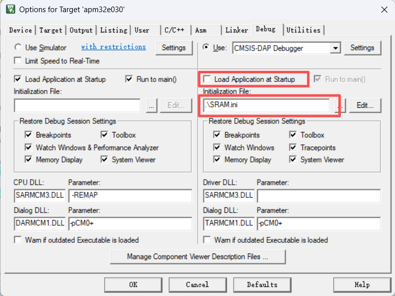 由于程序已映射至SRAM,需使用专门的调试脚本进行加载。创建或修改SRAM.ini文件,配置关键初始化操作,包括:
