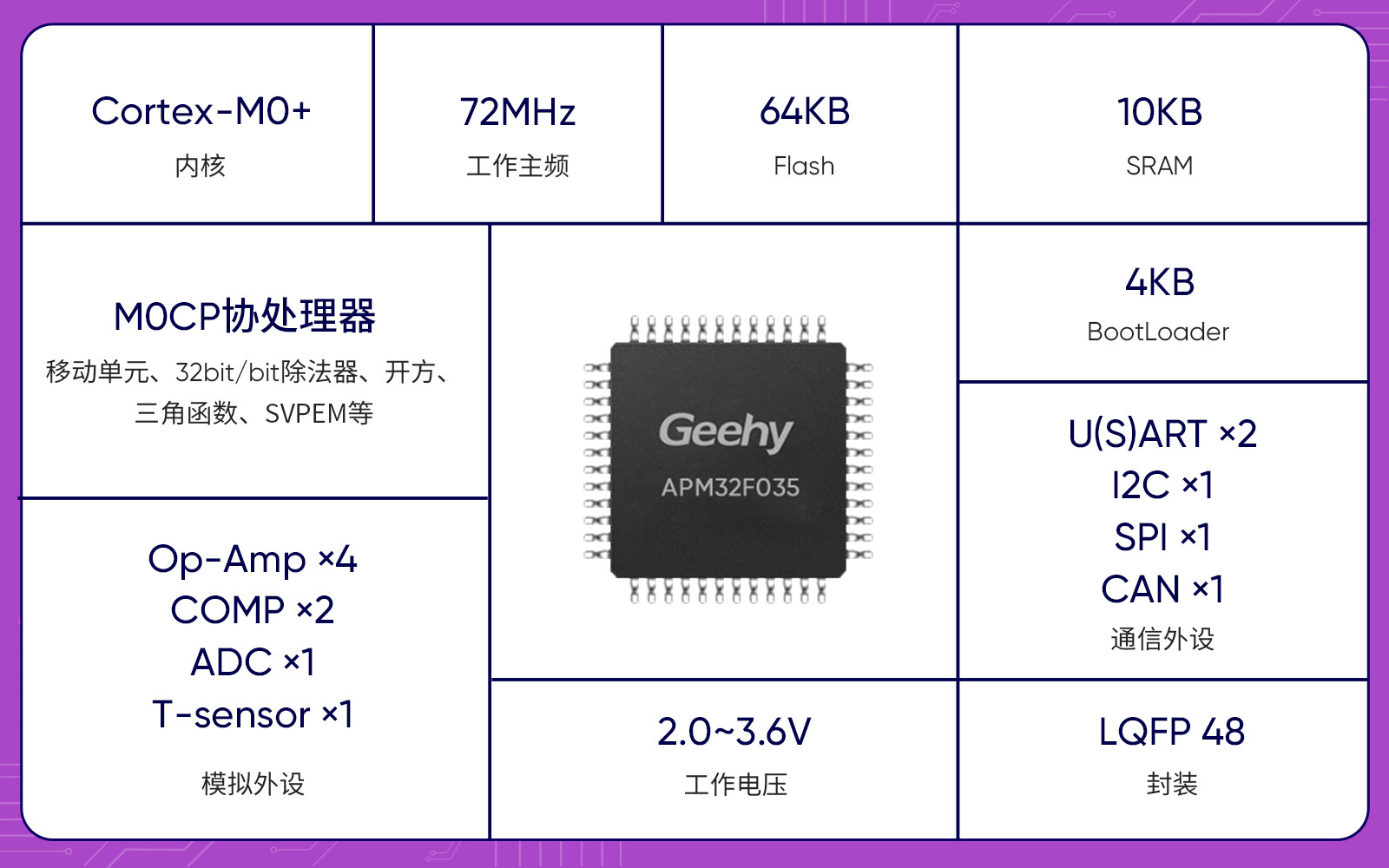 极海APM32F035是一款专为电机控制设计的高性能32位MCU,基于Arm®Cortex®-M0+内核,主频高达72MHz,内置M0CP协处理器,支持硬件级FOC(磁场定向控制)算法加速。芯片集成高速ADC、运放、比较器、PWM定时器等丰富模拟与数字外设,极大简化外围电路设计,提升系统可靠性。