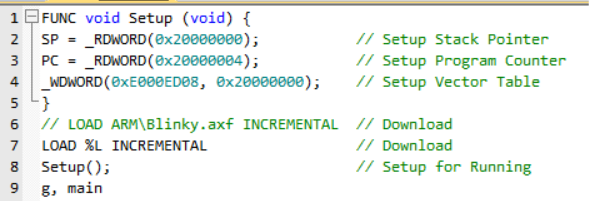 由于ROM空间指定为SRAM区域,因此程序不能下载到片内FLASH中,需要修改KEIL配置,其中有个关键的脚本文件SRAM.ini