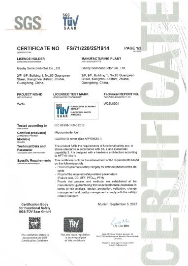 IEC 61508被业界视为“从硅片到整机”的安全圣经,其SIL 2 SC3等级意味着芯片在随机硬件失效概率、系统性容错、故障诊断覆盖率等维度均达到工业级严苛阈值。此次认证覆盖G32R501D的全生命周期:从需求规格、架构设计、故障模式与影响分析(FMEDA),到自检库(STL)与失效注入测试,SGS中德两地功能安全专家先后完成“本土初评+德国终审”的双重把关,确保每一项指标都满足全球通用条款。极海也因此收获一张同时具有“中国速度”与“德国严谨”背书的国际通行证。